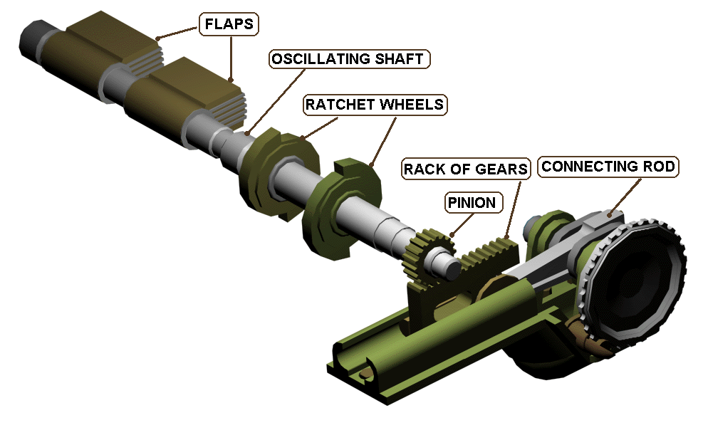 Return to Book mark The Oscillating shaft is fitted with two flaps & two ratchet wheels arranged in opposite directions. Also fitted with a pinion gear wheel at the end to engage with a rack of gears attached to a connecting rod. The connecting rod is coupled to a freely driven crank gear, permitting the pinion and the shaft to oscillate within a defined amplitude. Thus the movements of the shaft is controlled to perform the combustion cycle.