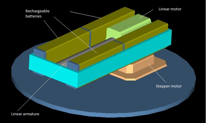 Linear motor armatures are equipped with rechargeable battery banks that effectively share the thruster's weight with the movable portion of the linear motor. Meanwhile, the majority of the linear motor's components are firmly attached to the stationary section. This design enhances efficiency and functionality.